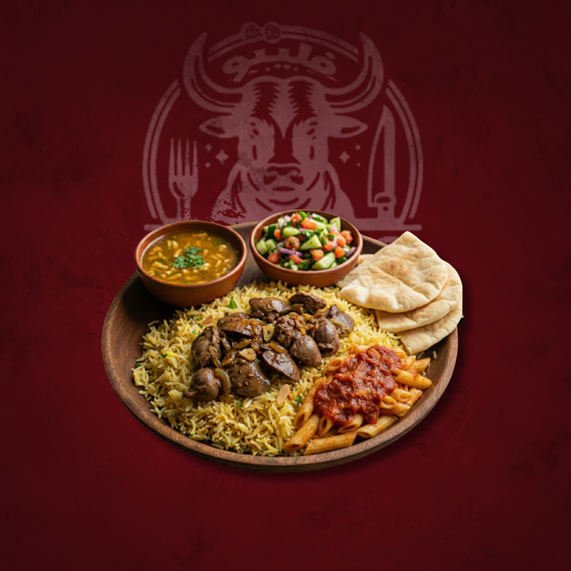 وجبه كبد وقوانص - مكرونه او رز - شوربة لسان عصفور - عيش - سلطات