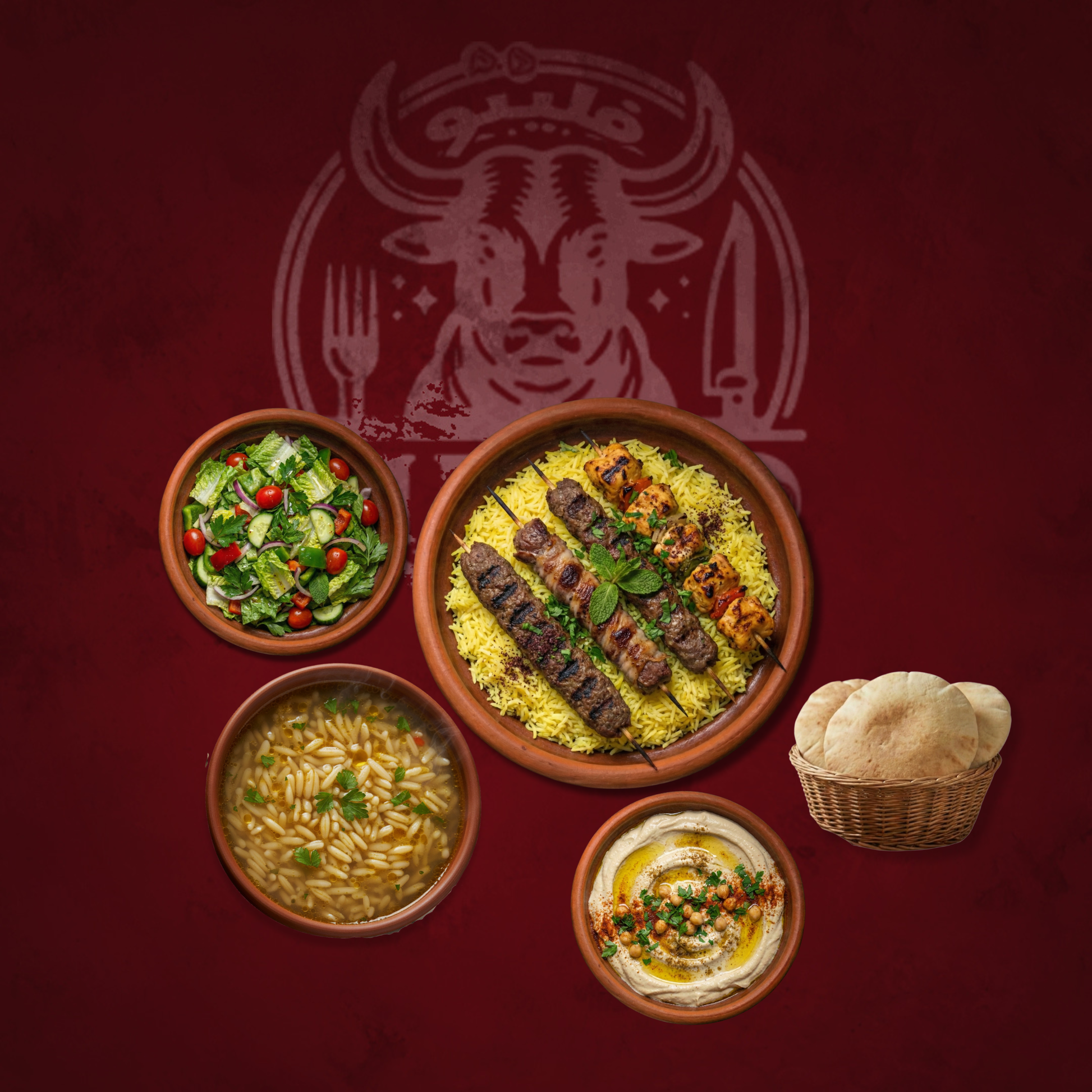 سيخ كباب - سيخ كفته - سيخ شيش طاووق - رز بسمتي - سلطات - عيش - شوربة لسان عصفور